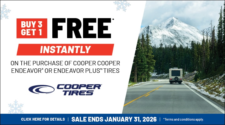 *Savings vary by location and tire. Valid on qualifying purchases from 01/01/26-01/31/26. Instant savings offer (Buy 3 Cooper Tires Get 1 Free) must be completed at time of purchase of select sets of three (3) Cooper tires. Installation is not included. Instant savings offer has no cash value and is non-transferable. Offer subject to availability and may change at any time. Additional taxes and fees may apply. Additional charge for shop supplies may be added. Redeem at participating locations only. Terms and conditions apply. See Store Teammate for further details.